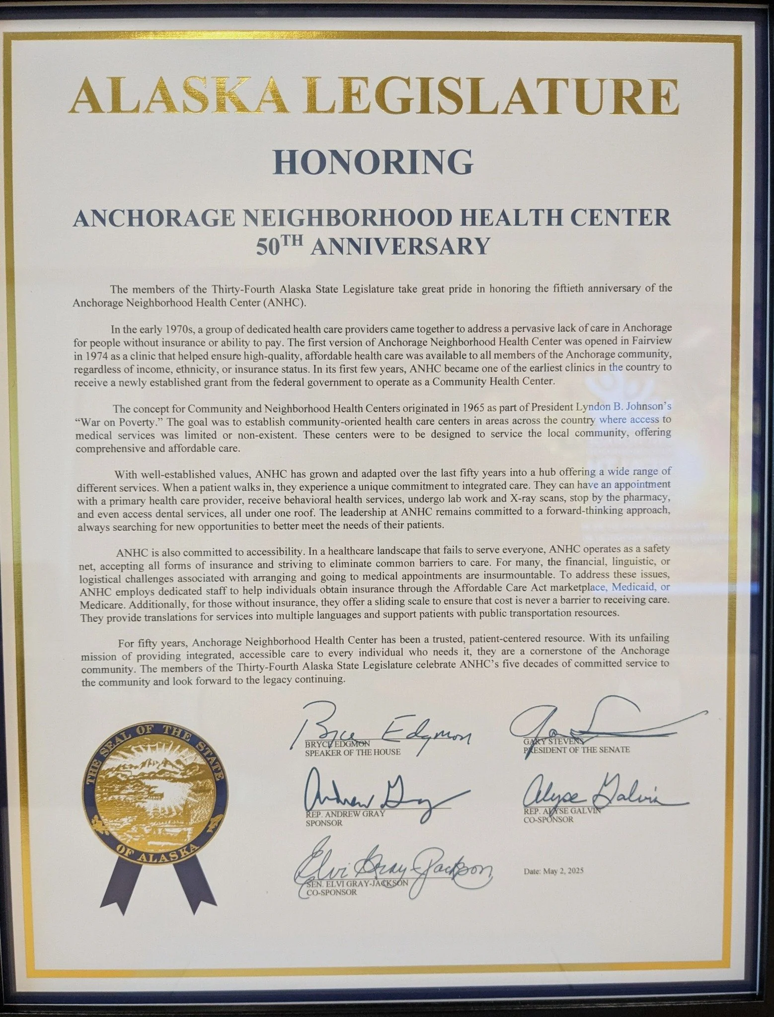 As ANHC celebrates its 50th anniversary, this recognition from the Alaska Legislature affirms what patients and community members have known for decades: Anchorage Neighborhood Health Center is a place where care, dignity, and community come first.
