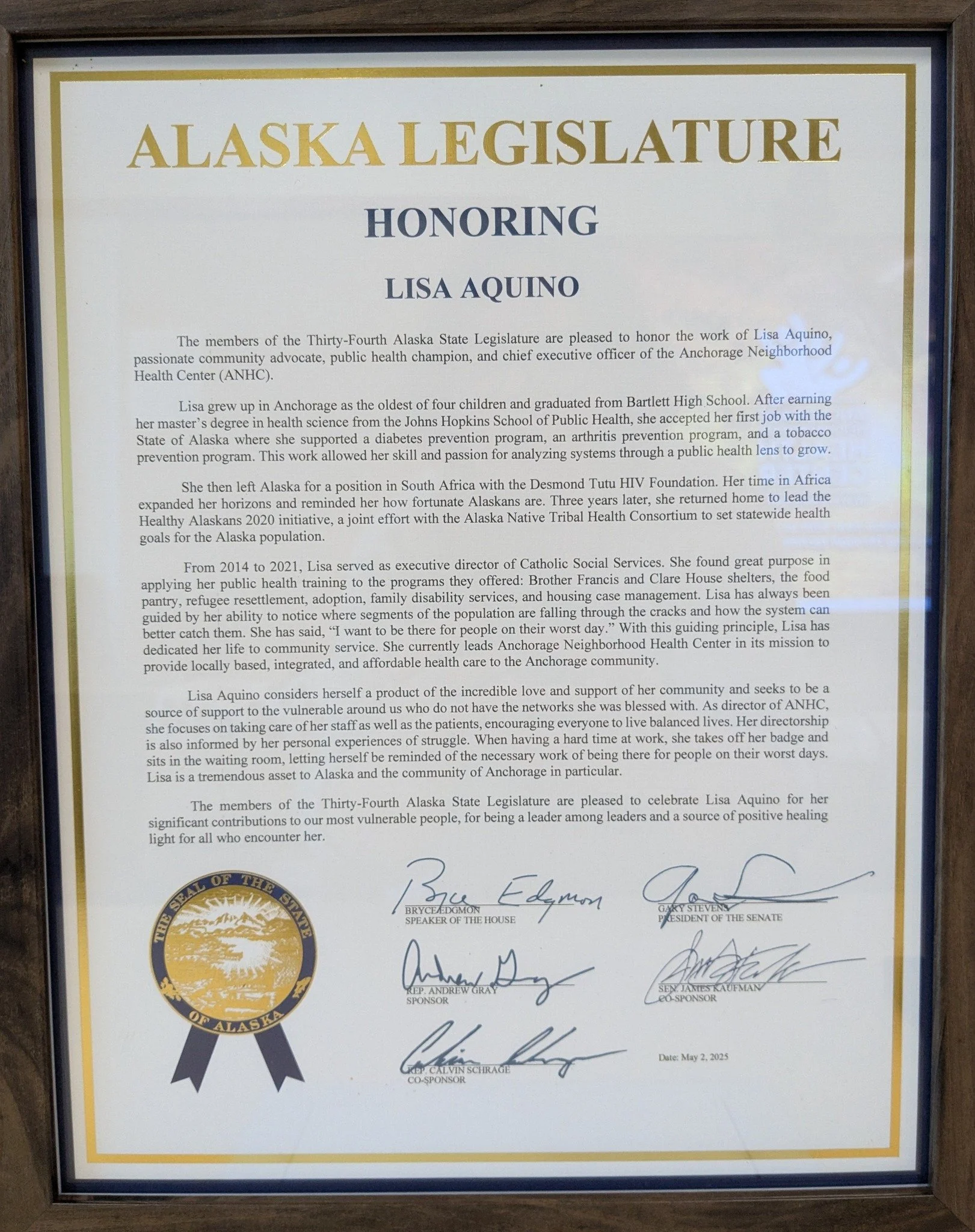 The Legislature recognized Lisa’s career path—from her early public health work with the State of Alaska and international experience abroad, to her leadership roles in nonprofit and social service organizations, and ultimately her stewardship of ANHC. The citation emphasizes her guiding principle: showing up for people on their hardest days and ensuring systems work better for those who too often fall through the cracks.